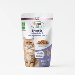 filets avec 85 % de viande (65 % poulet, 15 % foie, 5 % estomac d'agneau), hydrolysat de foie de poulet 2 %, lignocellulose 1,5 %, farine de pois, carbonate de calcium 0,3 %, chlorure de sodium 0,3 %,...