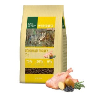 viande fraîche de dinde (31 %), protéine de poulet (19,5 %), protéine de dinde (9 %), flocons de pomme de terre (8 %), fécule de pomme de terre (8 %), graisse de poulet (5,5 %), protéine de pomme de terre (4,5 %), protéine de poulet hydrolysée (3 %), foie de poulet frais (2 %), pommes (2 %), cellulose en poudre (1,8 %), graines de lin (1 %), épinards (0,5 %), sel gemme (0,35 %), huile de tournesol (0,3 %), fructo-oligosaccharides (0,2 %), canneberge (0,07 %), mannane-oligosaccharides (0,04 %), romarin (0,04 %), menthe à chats (0,04 %), persil (0,04 %), ortie (0,04 %), camomille (0,04 %), enveloppes de graines de psyllium (0,03 %), yucca schidigera (0,02 %), groseilles (0,01 %), myrtilles (0,01 %), baies d'aronia (0,01 %), farine d'algues marines (0,01 %, ascophyllum nodosum). vitamines et additifs.